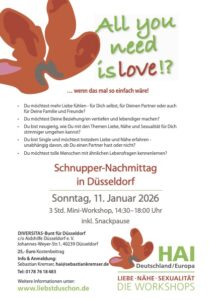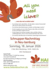 Wirklich liebevoll mit anderen und sich selbst in Verbindung sein – so einfach und so schwer: Dieses Herzstück der Workshop-Reihe bietet eine sichere, vertrauensvolle und unterstützende Umgebung, in welcher Freude, Genuss und die Fähigkeit Nähe zuzulassen wachsen können. Spielerisch, liebevoll und unterstützend zugleich bietet er Wege an, Liebe, Nähe und Sexualität mehr in unseren Alltag zu integrieren. Wie alle HAI Workshops besteht er aus einer Reihe experimenteller Zweier-, Kleingruppen- und Großgruppenübungen, in denen es um Kommunikation, Wahlmöglichkeiten und Berührung geht. Die persönlichen Entscheidungen jedes Einzelnen werden jederzeit respektiert, da wir alle Übungen als Einladungen verstehen.